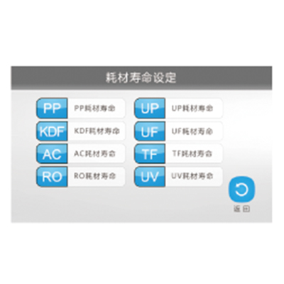 对纯水系统的各种耗材寿命均可设定,显示已使用时间及用量,到期自动提醒更换。